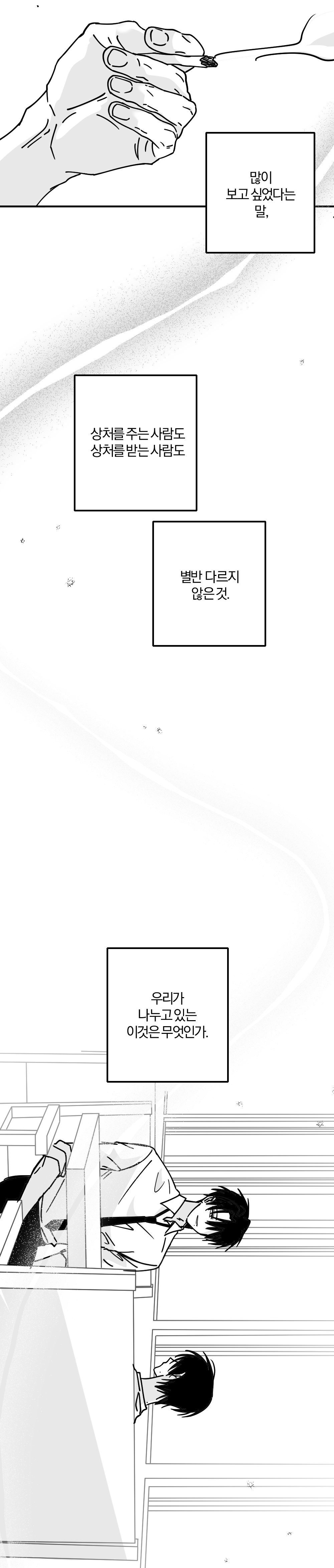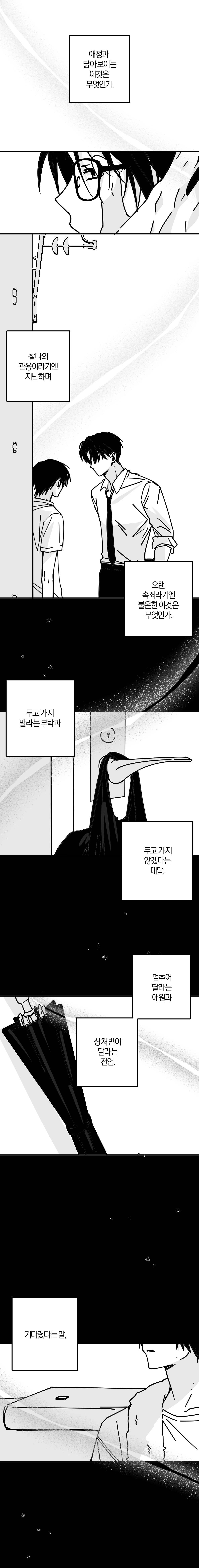 툭, 위태롭게 이어 붙여두었던 무언가. 어느 비 오는 밤 아주 가늘어졌던 그것이 마침내 끊어진다. 사람이 붐비지도 지나치게 조용하지도 않은 가게 안, 생활 소음이 들려오는 구석의 마주 보는 한자리가 한계였다. 박음질이 시원찮던 실밥이 튿어지듯 연약한 소리가 바로 귓가에서 터졌다. 그날로부터 겨우 두 달을 버틴, 조금 흐린 오후의 일이다. "세이지는 나랑 뭐가 되고 싶어?" 나한테 뭘 원해? 이것으로 자그마치 세 번인가. 세 번의 순회 끝에 다시금 자리를 찾아 되돌아온 물음과 재차 얼굴을 마주한다. 어떤 감정도, 어떤 관계도 처음과 같을 수 없었다. 그런데도 그 질문의 형태만은 처음과 조금도 달라지지 않아서⋯⋯ 세상에도 이렇게까지 여전한 것이 있구나, 싶었다. 희미하게⋯ 웃을 수도 있을 것 같았다. 이전처럼 화는 나지 않았다. 허탈한 숨이 새지도 않았다. 그저 지난 답을 복기한다. 다시 묻는다는 것은 결국 무엇도 정답이 아니었다는 것이니까. 첫 번째 물음 앞에선 상처받았다. 두 번째 물음 끝에는 당신에게 상처를 주었다. 그리고 이것으로 세 번째. 내가 원하는 것은 무엇인가. 당신의 입으로 인정하는 탈선에 저도 모르게 질끈 눈을 감았다. 또렷하게 발음했으나 점차 끝이 흐려지는 목소리에 겨우 다시 뜬다. 매 순간 혼란을 견디는 것밖에 할 수 없는 자신과는 다르게, 모든 것을 명료하게 정의 내린 이의 얼굴을. 쏟아내었지만 결코 홀가분해 보이지 않는 기색들, 기나긴 교착을 마무리 지을 어떤 말을 기다리는 듯한 침묵을 차례로 마주 한다. 끝이 피고 있다. 약속대로 그것만큼은 나의 손에 있었다. 한 달에 한 번씩 만나 밥을 먹을 뿐인 관계. 오랜 시간 무명이었던 이름과 비워두었던 답안지에 무엇을 적을 것인가. “그런 말로는 안돼요…….” 혼자서는 도저히 갈무리할 수 없는 곪은 감정들을 차근히 뱉는다. 장난 같은 말들과 친근한 듯 부르는 몇 번의 이름, 모두에게 적당히 내어줄 수 있는 웃음만으로 쉽게 정을 얻어내는 그 여유가 얄미웠다고. 선생이라는 자리를 명분 삼아 휘두를 수 있었던 그 타당성과 허울 좋은 변명들. 외로움과 약함을 가장해 붙잡아두던 손길이 적선과도 비슷한 것을 알았을 때 느껴야 했던 검정. 또…… 좁힐 수 없을 16년의 간극. 그로부터 기인한 홀둔함에는 종종 짜증이 났다는 사실을. 나를 대상으로 하던 당신의 모든 무신경한 말들과 무책임한 행동들이 싫다는 말까지 남김없이. 그 사람을 이루고 있는 모든 불분명함을 나는 결코 좋아할 수 없다. 보지 않아도 될 것을 보게 하고, 몰라도 되는 감정을 알게 했다. 그 조금의 변색을 눈치채고, 오염이 두려워 끄트머리를 잘라내는 비겁함이 싫으면서도, 접착력이 다한 단면을 이어붙일 수 있는 뻔뻔함이 부러웠다. 4월의 스무 번째 날을 빌미로 한 여상한 내용의 연락과, 그럴듯한 이름 없이도 전과 같을 것이라고 자신하는 만용. 의미가 모호한 선물, 그런 것을 쉽게 건넬 수 있는 안이함. 그런 부분들은 얼마든지 있었고, 그러므로 당신의 결함을 나는 한 마디로 씻어낼 수 없다고 똑똑히 말한다. "있죠, 저는 선생님이 아니어도 괜찮았을 거예요." 가끔은 정말 억울하다는 생각이 들었다. 당신은 지금의 내가 있어 달라진다고 했지만 그때의 나는 누구여도 좋았을 것이다. 꼭 특정한 누군가일 필요는 없었다. 그것이 남자든 여자든, 어른이든 아이든 상관없었다. 어쩌면 사람이 아니었을 수도 있을 것이고, 털이 부드러운 동물이나 창가에서 조용히 날개를 접는 곤충일 수도 있었다. 커다란 위로 같은 것은 필요치도 않았다. 그저 조금, 아주 잠시 동안만 옆자리를 내어주었으면 되었음에도. "……그래도 선생님 뿐이었어요." 하필이면 당신이 그곳에 있어서. 그것으로 외로움이 그곳에 있는 것을 알았다.